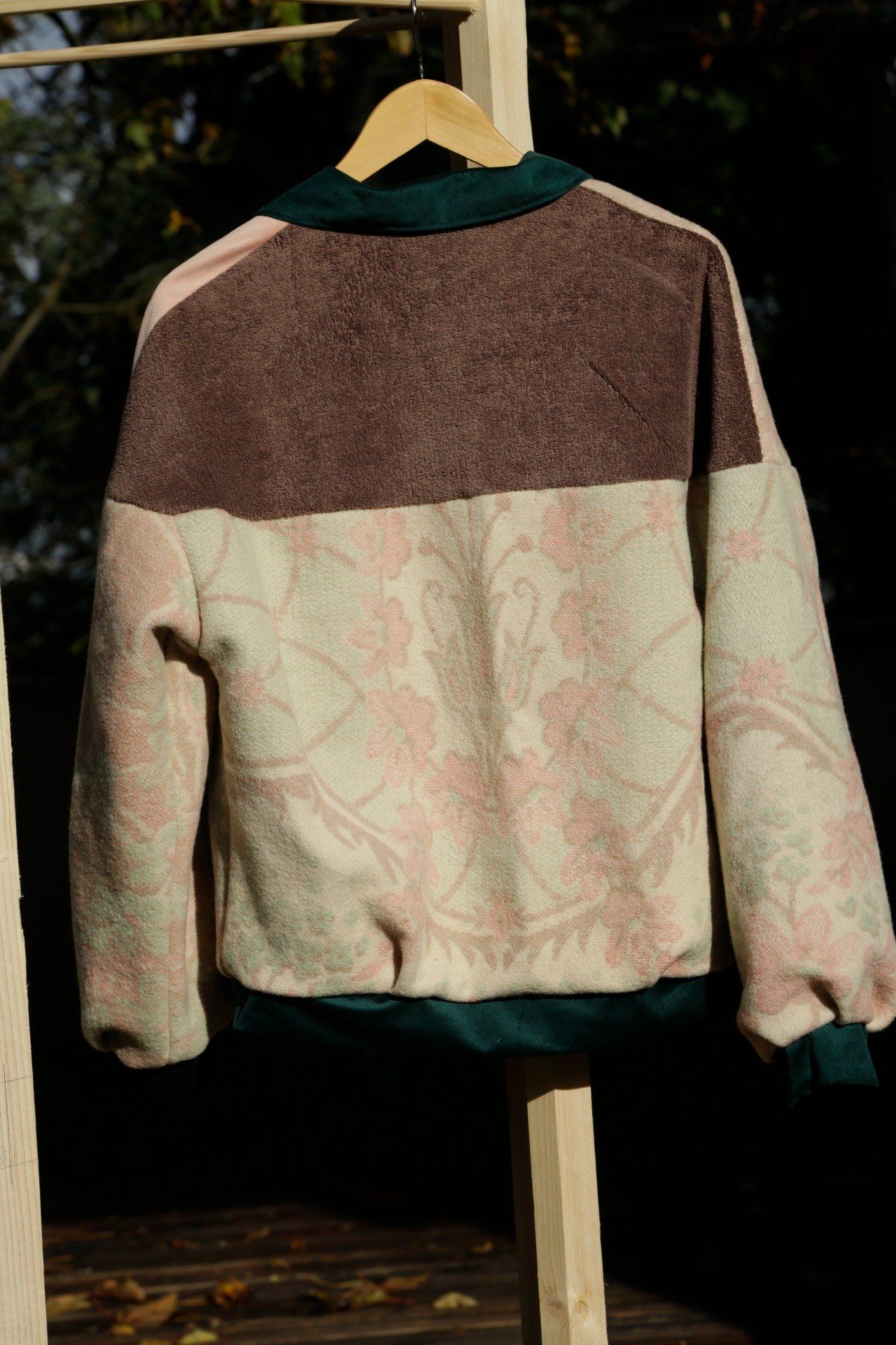 Bomber vert et rose pale fleuri surcyclé à partir d'une ancienne couverture