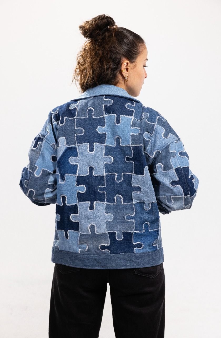 La Veste en Jean Puzzle se distingue par son design innovant et tendance. Chaque pièce est assemblée avec précision, créant un motif de puzzle qui donne une allure contemporaine et sophistiquée. C'est l'élément parfait pour rehausser n'importe quelle tenue, que ce soit pour un look décontracté ou plus habillé.